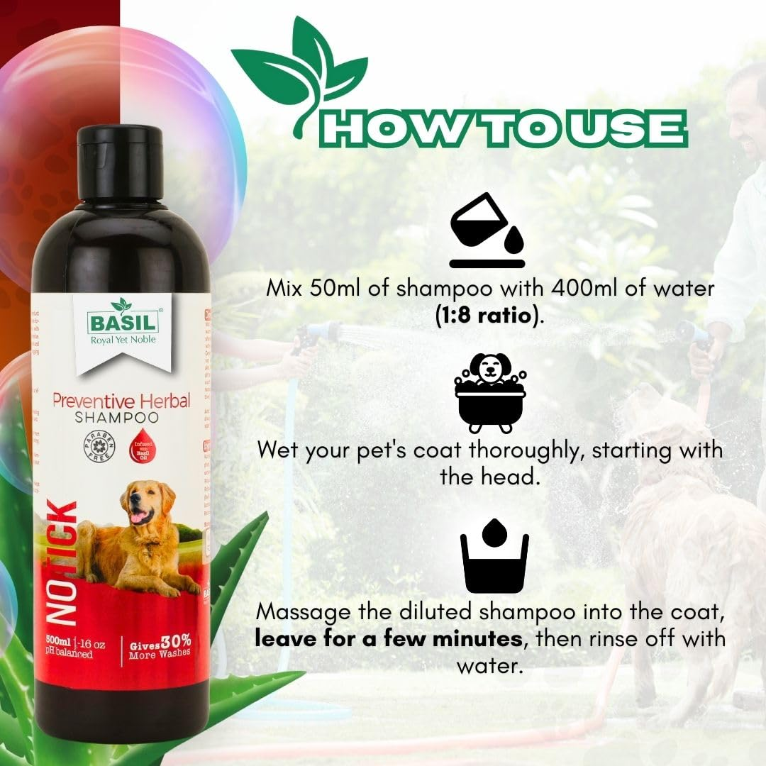 BASIL No Tick Herbal Pet Shampoo | Anti-Bacterial Formula | Itch Relief for Pets | Effectively Removes Ticks & Fleas | Softens, Strengthens, and Adds Shine to Fur | Paraben-Free