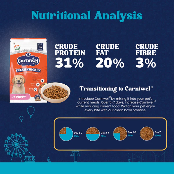 Carniwel Dry Dog Food is specifically formulated for large breed puppies, ensuring they receive balanced nutrition for healthy growth. Glucosamine and chondroitin support joint development and maintenance, promoting flexibility and mobility. Enriched with Antarctic krill, the formula boosts immunity with antioxidants and essential nutrients. The balanced blend of fresh chicken, fish protein, and L-carnitine supports brain function and muscle development. Carefully selected ingredients, including vegetable fibers, prebiotics, and dehydrated chicken protein, ensure easy digestion and optimal nutrient absorption. Rich in omega-6 fatty acids from vegetable and marine lipids, Carniwel enhances skin and coat health, giving your puppy a shiny, healthy coat. Choose Carniwel to support your large breed puppy’s overall well-being and healthy development.