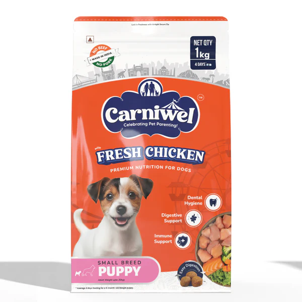 Carniwel Dry Dog Food is specially crafted for small breed puppies. The small-sized kibble aids dental health, making it easier for puppies to chew while promoting healthy teeth and gums. Enriched with Antarctic krill, the formula boosts immunity with antioxidants and essential nutrients. A balanced blend of fresh chicken, fish protein, and L-carnitine supports healthy brain function and muscle development. Carefully selected ingredients, including vegetable fibers, prebiotics, and dehydrated chicken protein, ensure easy digestion and optimal nutrient absorption. Rich in omega-6 fatty acids from vegetable and marine lipids, Carniwel enhances skin and coat health, giving your puppy a shiny, healthy coat. Choose Carniwel for complete nutrition and overall wellness for your small breed puppy.