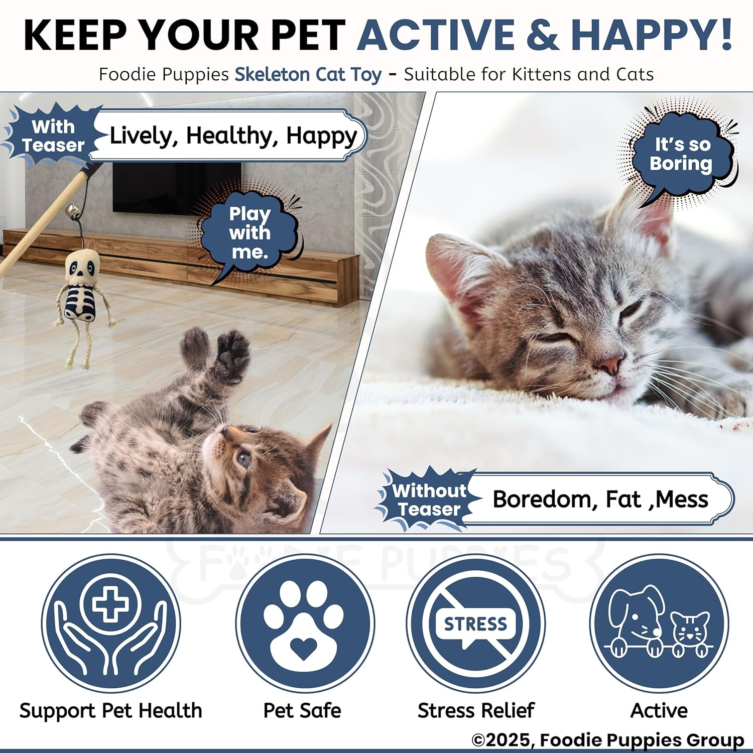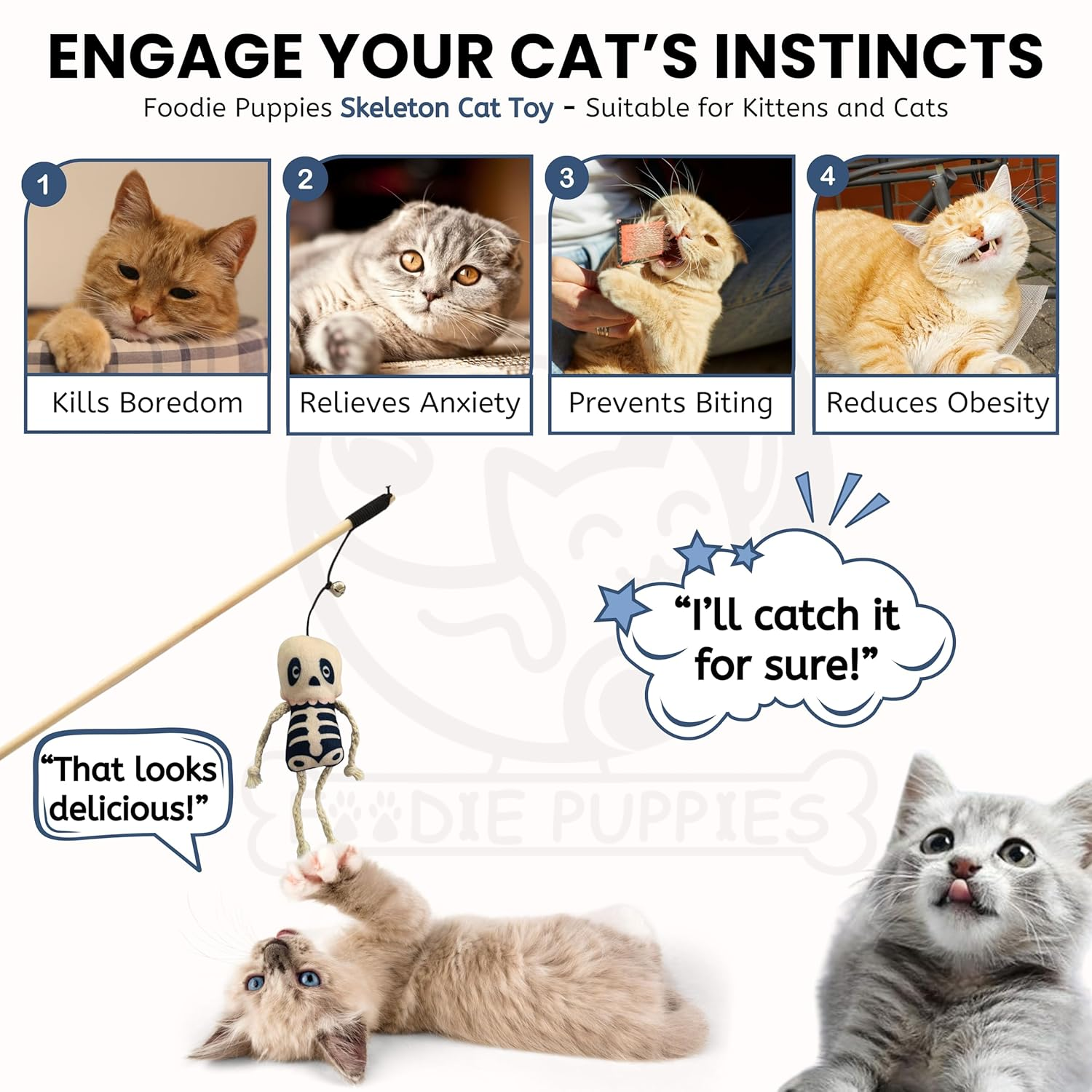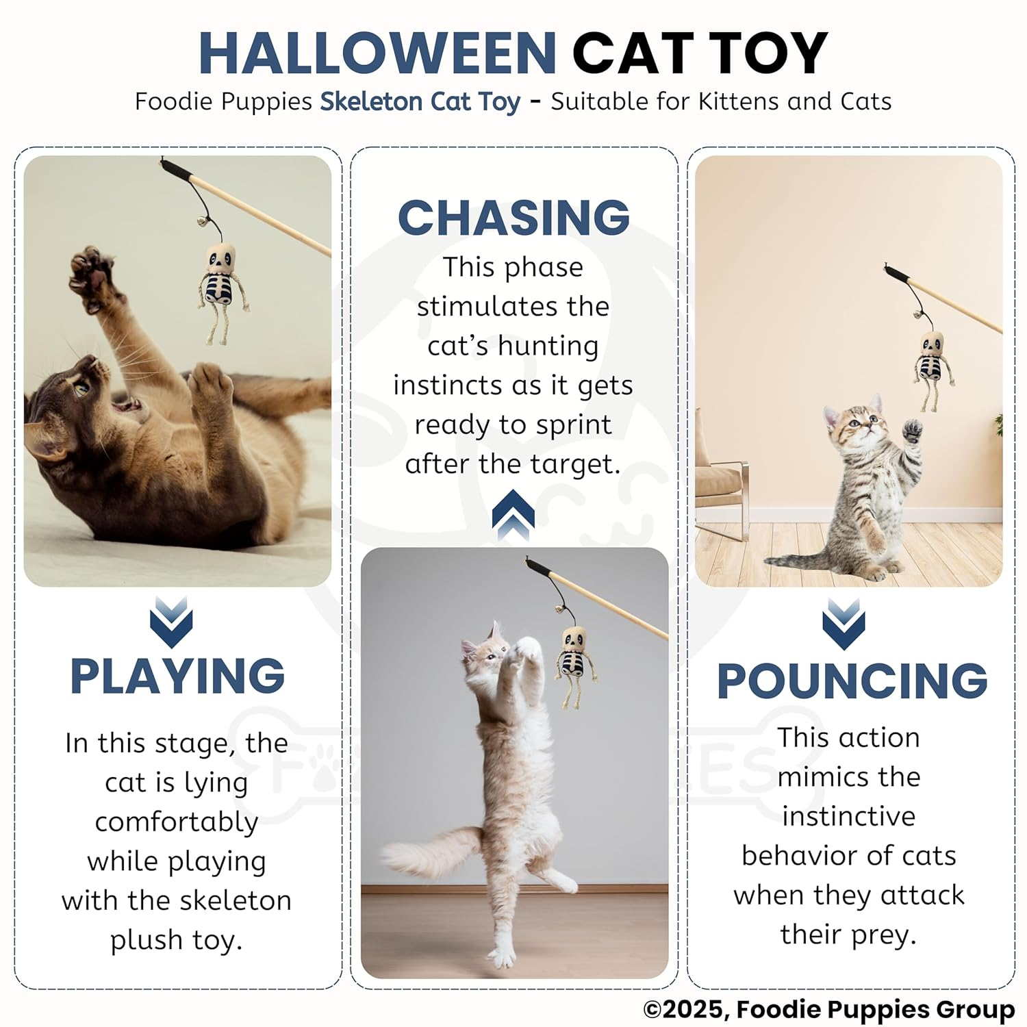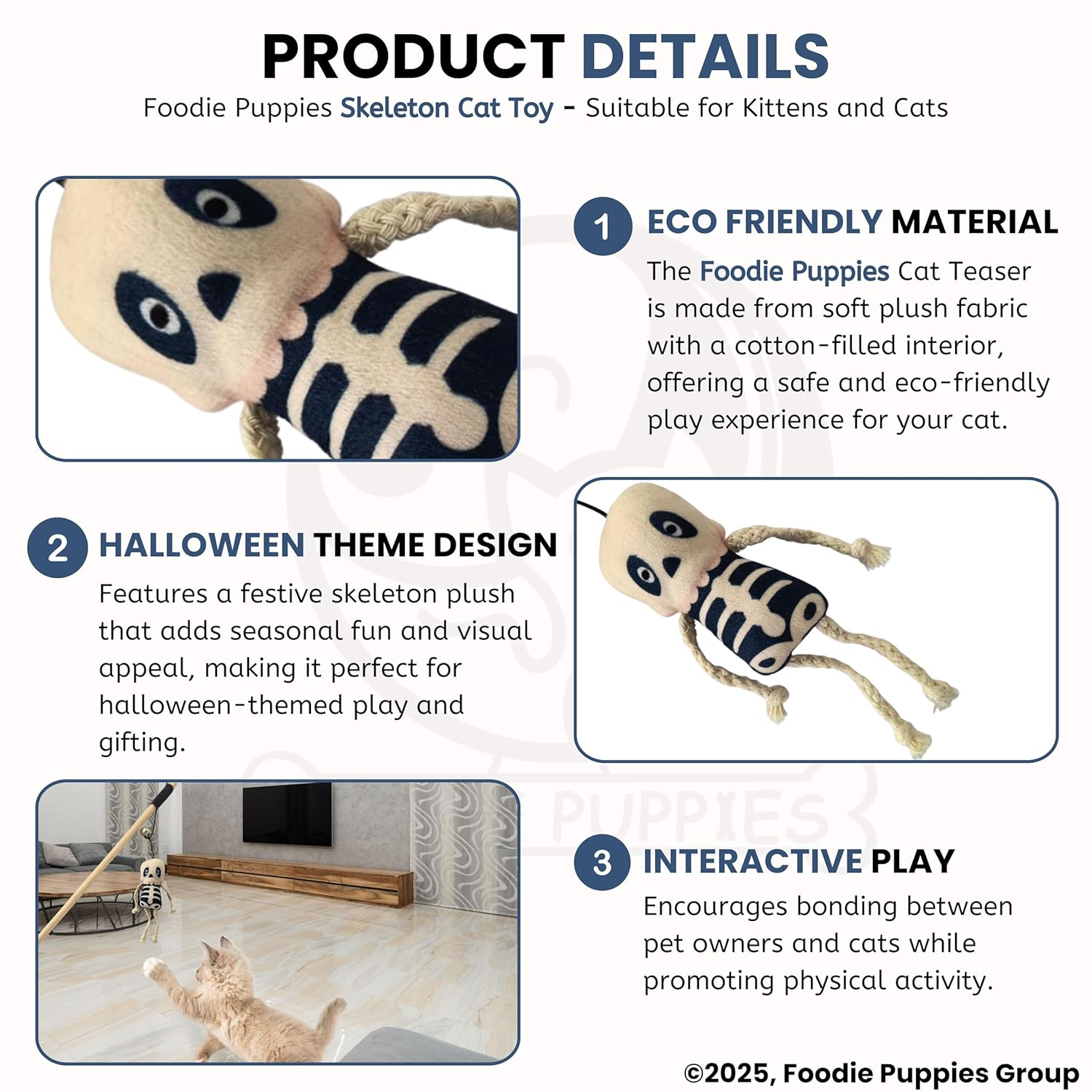 • Festive Halloween Design – Features a soft plush skeleton that adds seasonal charm and keeps your cat visually engaged during play.