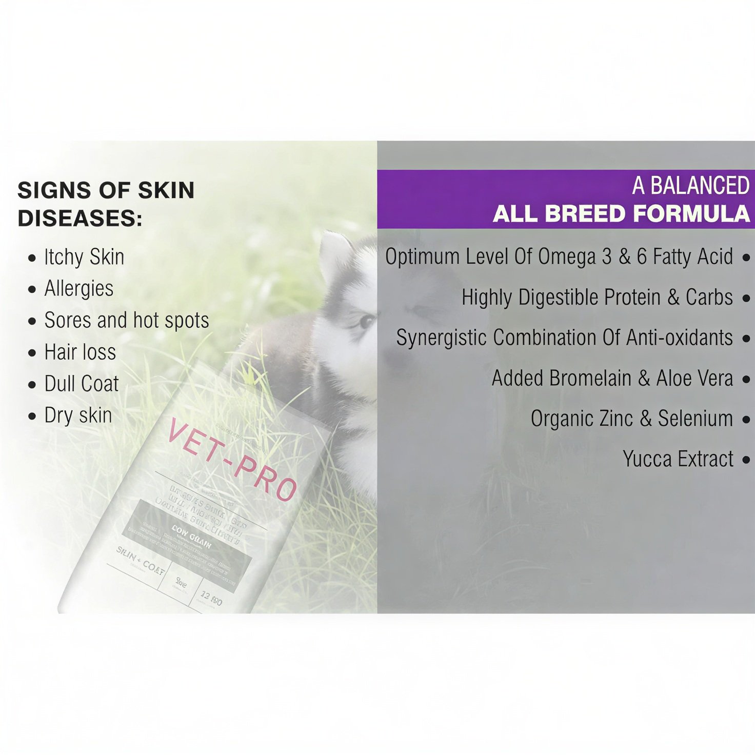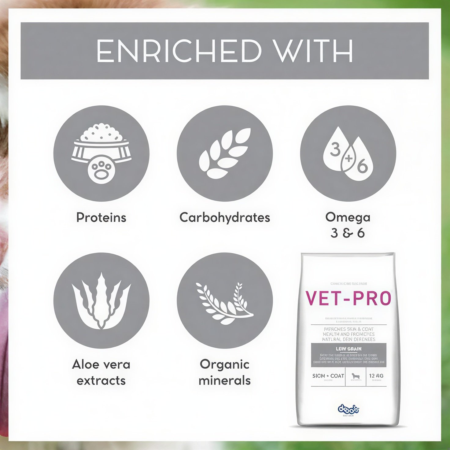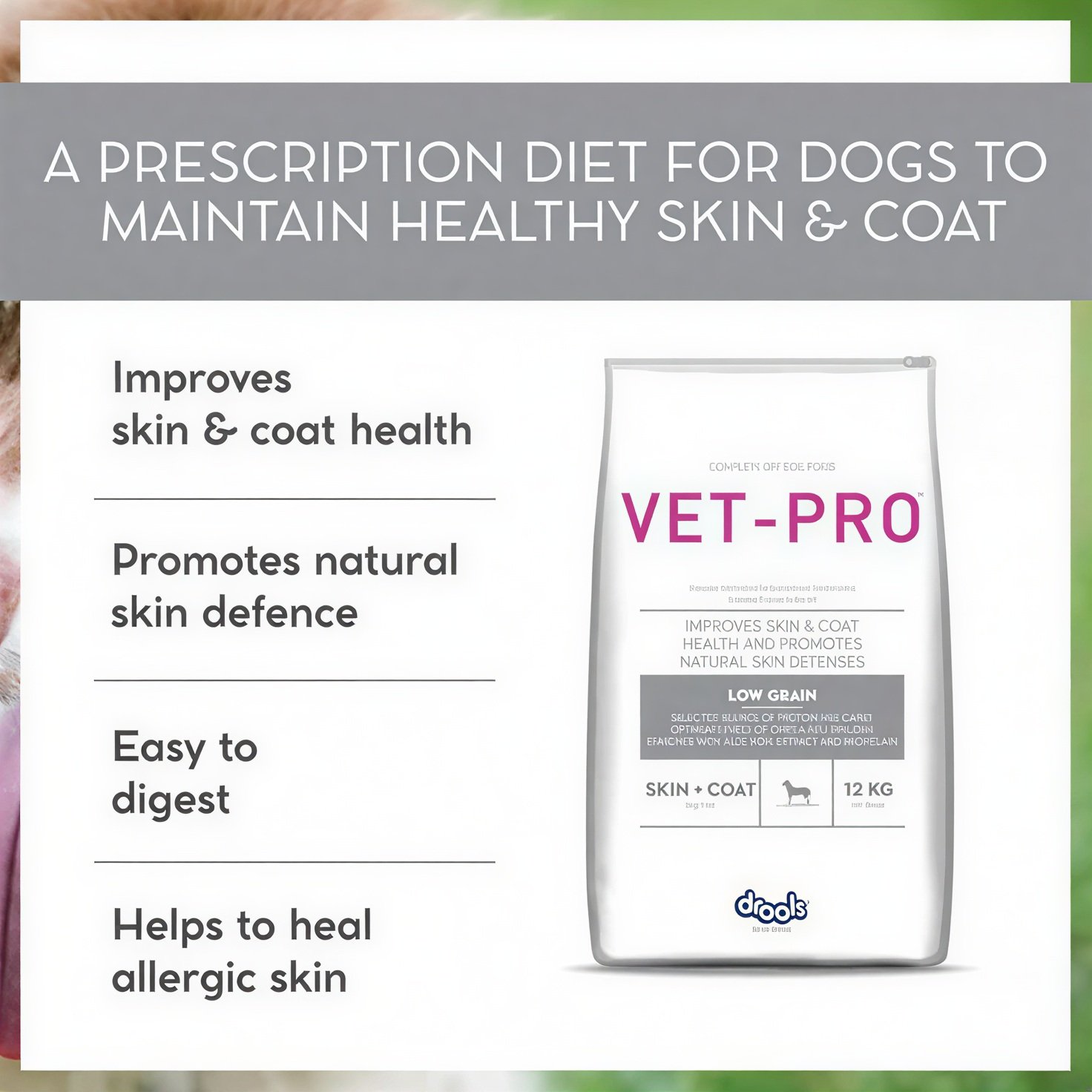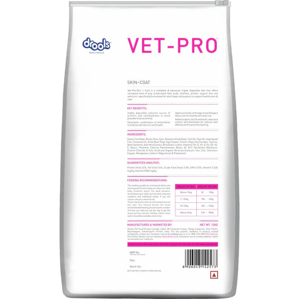 The carefully selected ingredients in Drools VET PRO Skin & Coat Adult Dry Dog Food work together to deliver visible results: