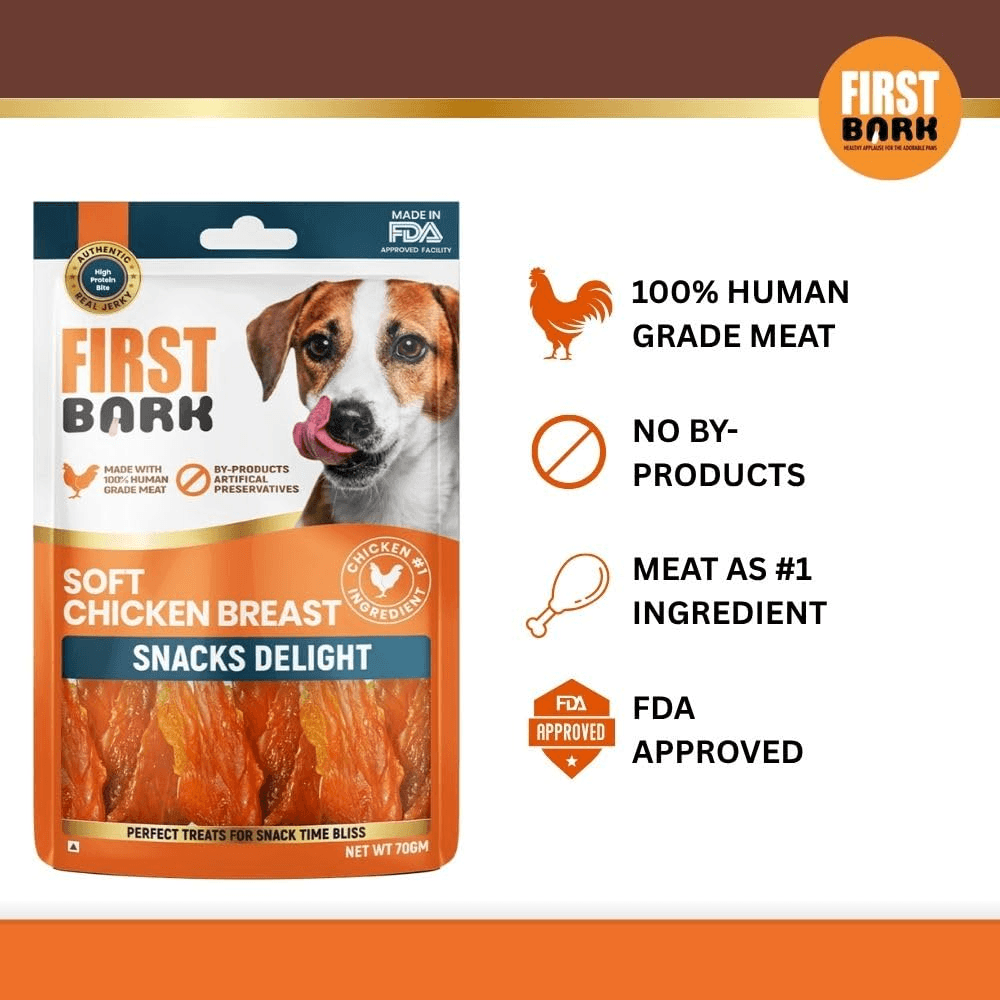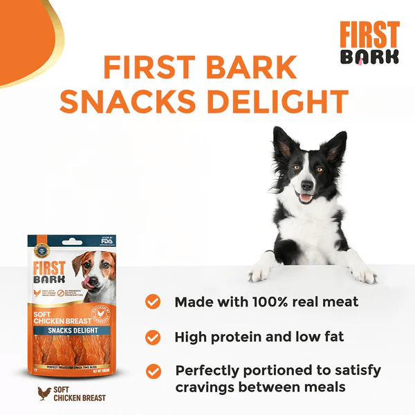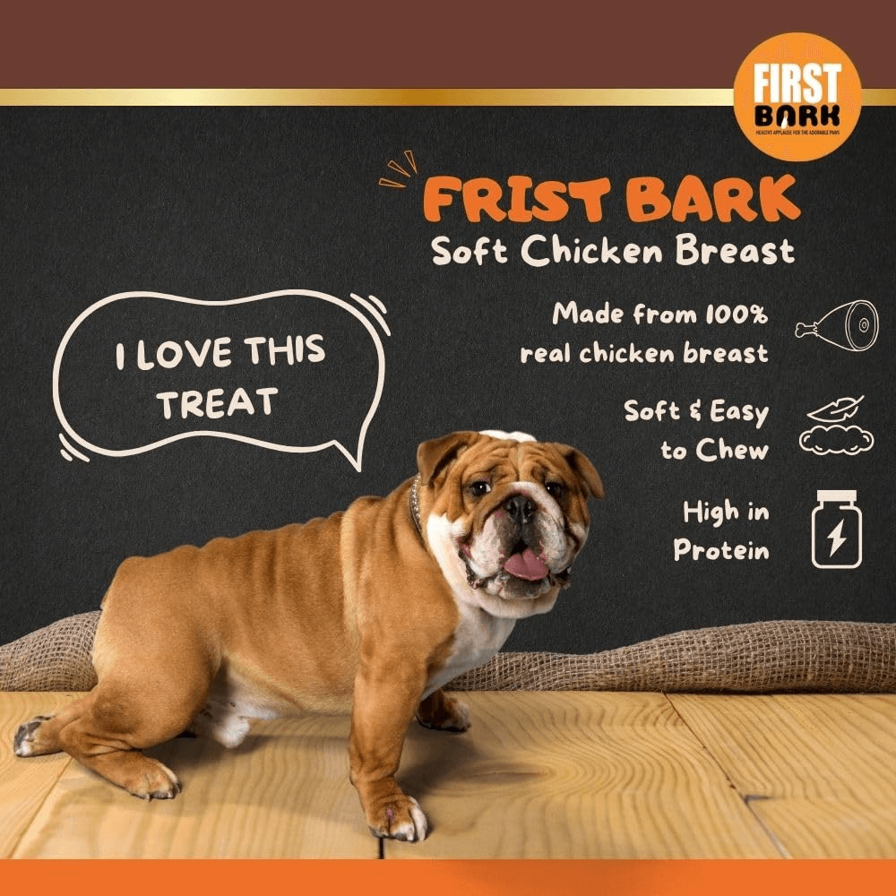 First Bark Soft Chicken Breast Delicious, Nutritious, Well-Balanced & Perfect Treat For Your Pet Chew Make Strong Teeth and Gums Ensure Good Overall Health of The Dog.