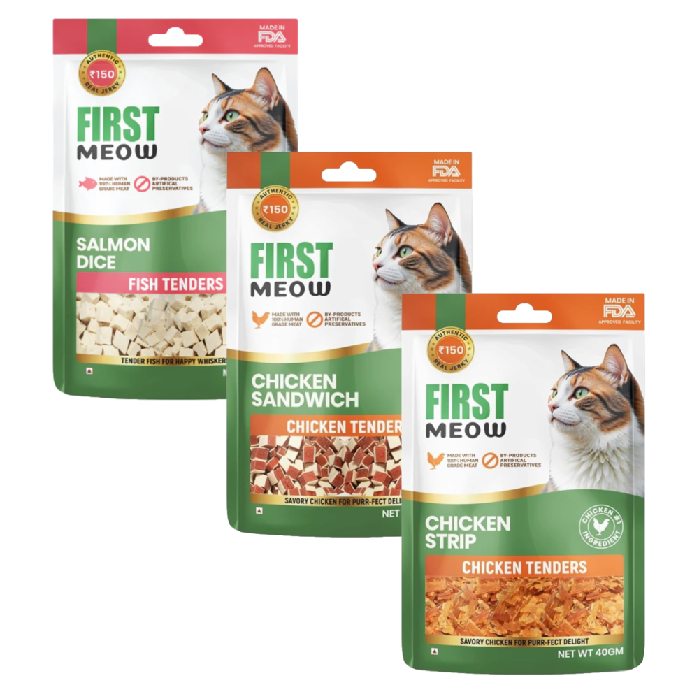 First Meow Cat Treats Combo Chicken Strip x1 & Chicken Sandwich x1 & Salmon Dice x1, (40g) (Pack of 3)