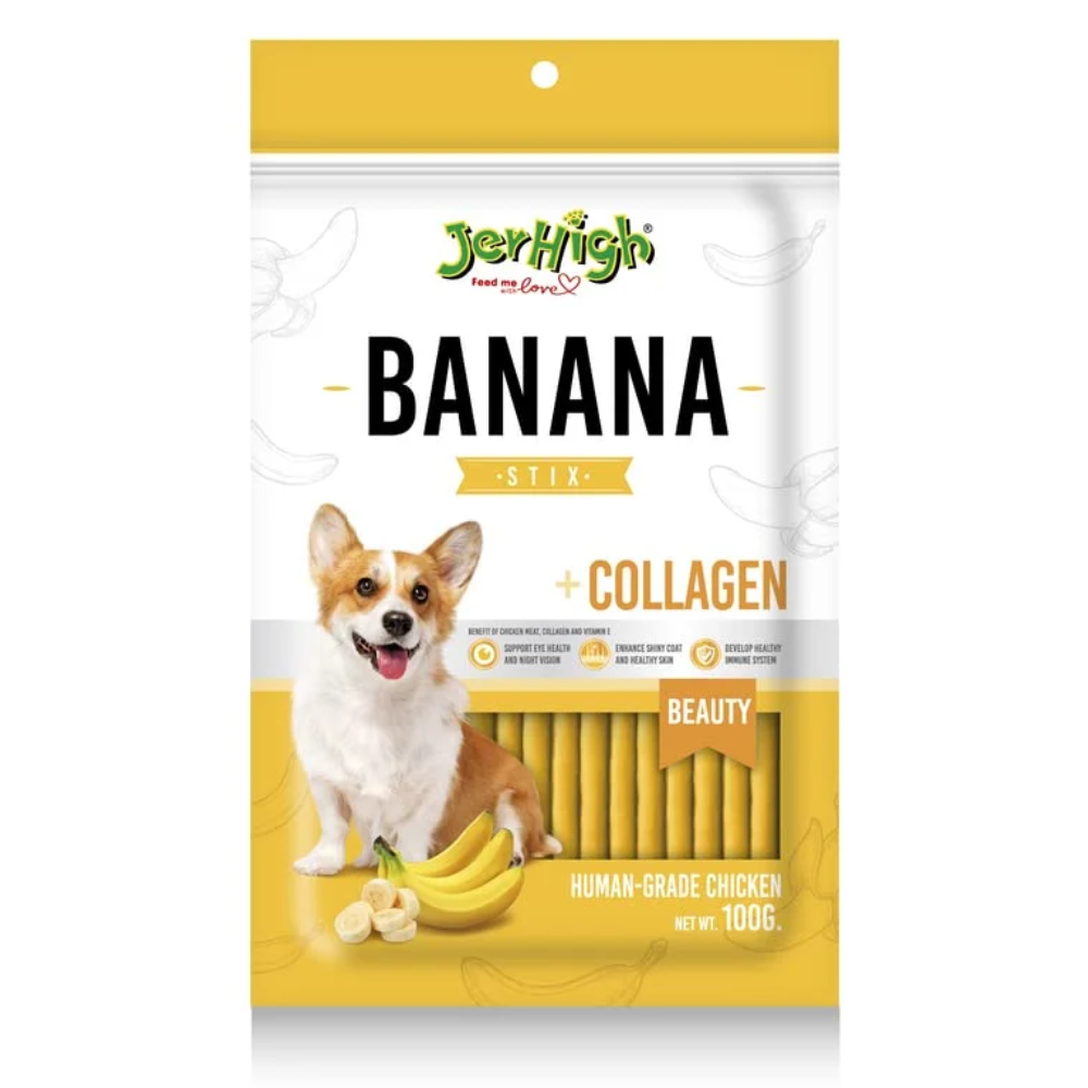 Your dog will fall in love with the taste of the JerHigh Banana Stick. Give your dog the best nutrition with these delectable snacks which are suitable for all dog breeds over the age of two months. JerHigh Banana Stick is a tasty treat packed with the nutritional goodness of essential vitamins and minerals and made with good quality protein-rich chicken. JerHigh Banana Stick Dog Treat is meticulously prepared to provide a pure, tasty and easily digestible snack filled with nutritional benefits for your dog’s health. Bananas are enriched with Vitamin A to support healthy vision, zinc to help in maintaining skin and coat, collagen to help reduce signs of ageing, Vitamin E, selenium and antioxidants which helps maintaining damage caused by face radicals and promotes healthy muscle growth. These dog treats are made from fresh meat and are high in protein to ensure a healthier and shinier coat. JerHigh Dog Treats are an excellent way to keep your canine companion healthy and playful. Continue to reward your pet during training to help reinforce good behaviour. JerHigh Banana Stick is made with balanced nutrients and provides a variety of health benefits for your pet’s well-being. These treats are in the shape of sticks, making them simple to feed and carry while still being easy and enjoyable for your dog to eat. It is ideal for feeding as a snack, rewarding good behaviour, and showing your pet love with some indulgent pampering!