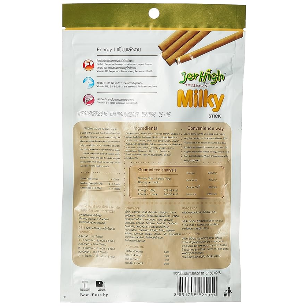 JerHigh Milky is a premium dog treat which can be given to dogs of all breeds and sizes. It composes of Chicken Meat and Milk which provides a lot of vitamins and minerals. It contain Vitamin C1, B5, B8 and B12 which improves brain function and Vitamin D3 which provides strong bone and teeth. JerHigh MilkyStick contains high protein and Vitamin B1 which helps in burning their body weight, increase metabolism, improves muscles strength and helps in managing your dog’s weight.
