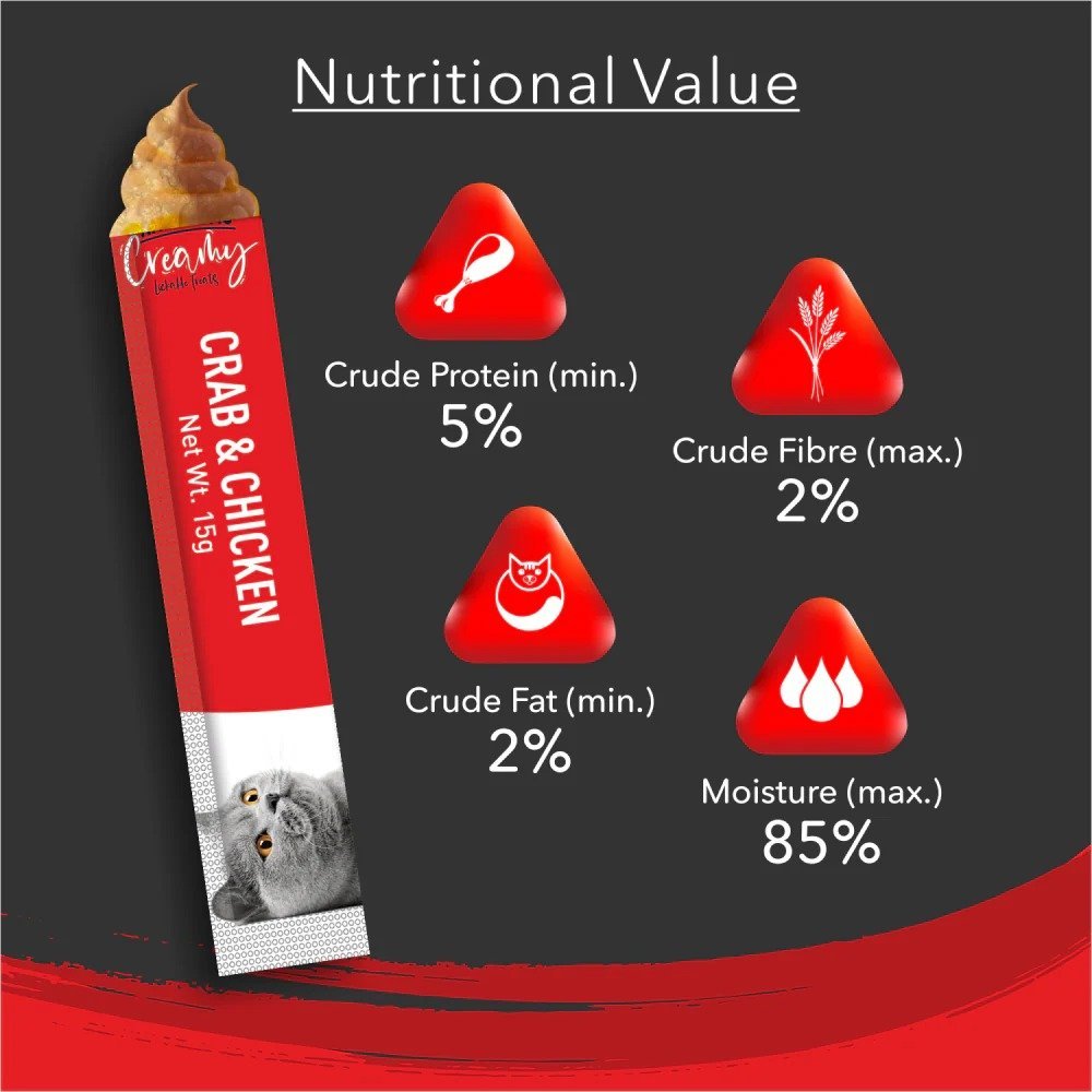 Chicken meat, Chicken liver, Hydrolyzed chicken liver, crab powder, Flavouring agent, Chicken oil, Modified starch, Gelling agent, Vitamins, Minerals, DL-methionine, Taurine, Green tea extract.