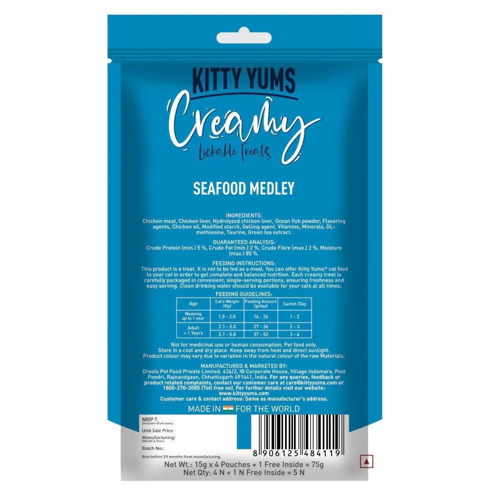 Chicken meat, Chicken liver, Hydrolyzed chicken liver, Sea Food powder, Flavouring agent, Chicken oil, Modified starch, Gelling agent, Vitamins, Minerals, DL-methionine, Taurine, Green tea extract.
