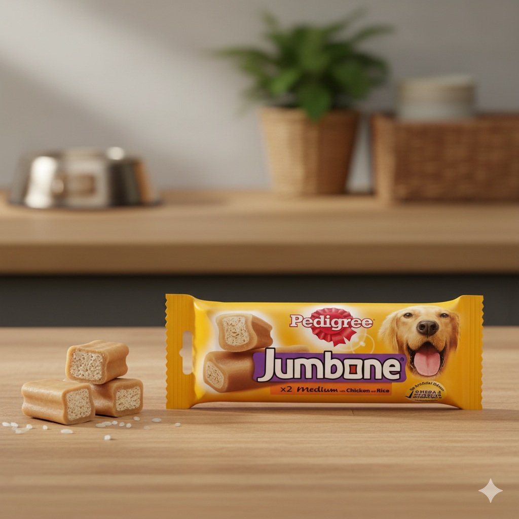 Looking for a bone for dogs? PEDIGREE® JUMBONE™ with Chicken and Rice is a long-lasting dog treat for adult dogs. Give your dog a treat he really deserves. PEDIGREE® JUMBONE™ in Chicken and Rice is a special dog treat for your special furry friend that will bring a smile on his face. A perfect longer lasting treat, JUMBONE™ cleverly combines a hard chewy outer cover with a delicious meaty centre – something he can really get his teeth into. It tastes fantastic too!PEDIGREE® JUMBONE™ with Chicken and Rice is complementary pet food for adult dogs and when given, ensure you reduce the main meal accordingly.PEDIGREE® recommends feeding 1 JUMBONE™ dog chew per week to dogs weighing 10 Kgs or more. Large dogs weighing over 25 Kgs can be given up to 2 chews per week.