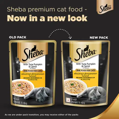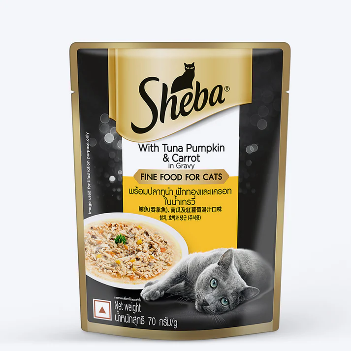 Sheba Fine Premium Adult (1+ years) Wet Cat Food, Tuna, Pumpkin & Carrot in Gravy, is a gourmet food crafted with real fish. It has a pleasing consistency & tantalizing texture. This Sheba wet cat food contains high moisture to keep your cat well-hydrated. It contains essential nutrients like protein, Vitamin E & minerals. It perfectly complements your cat’s complete & balanced diet.