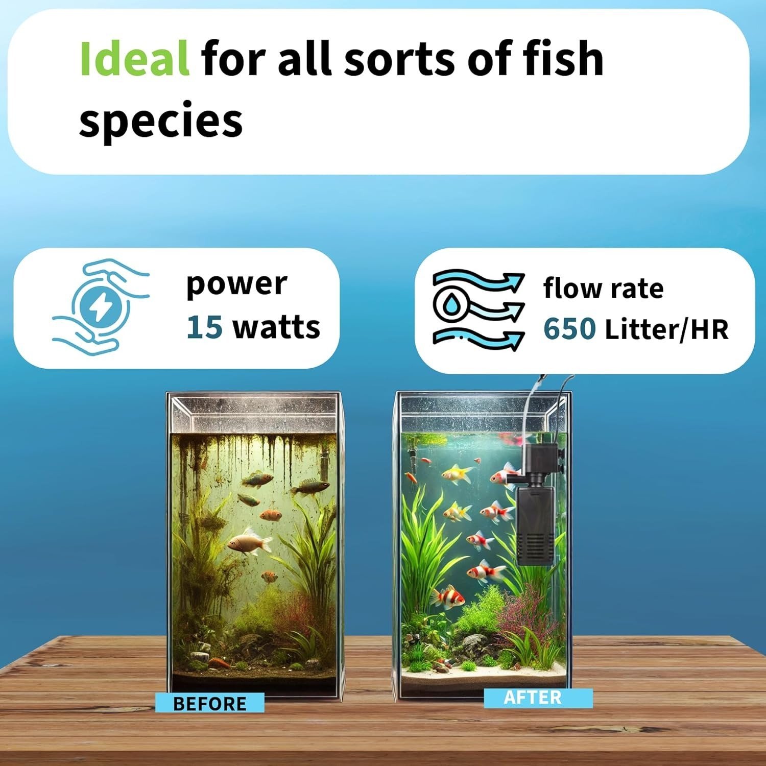 • 【Perfect for 1.5-2.5 Ft Tanks】 – Powerful 650L/H flow rate and 15W energy-efficient motor ensure optimal water circulation and filtration for tanks up to 250 liters (65 gallons), ideal for freshwater and saltwater aquariums.
