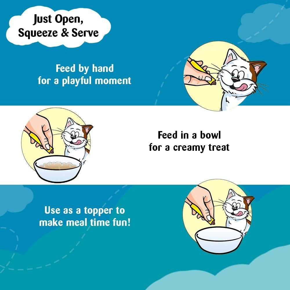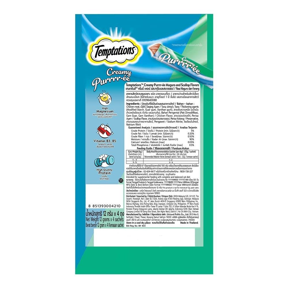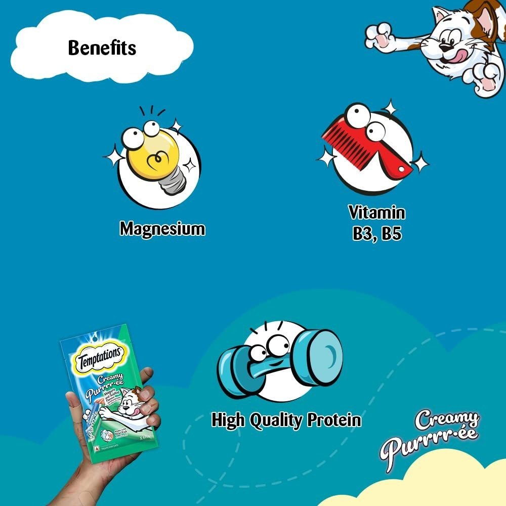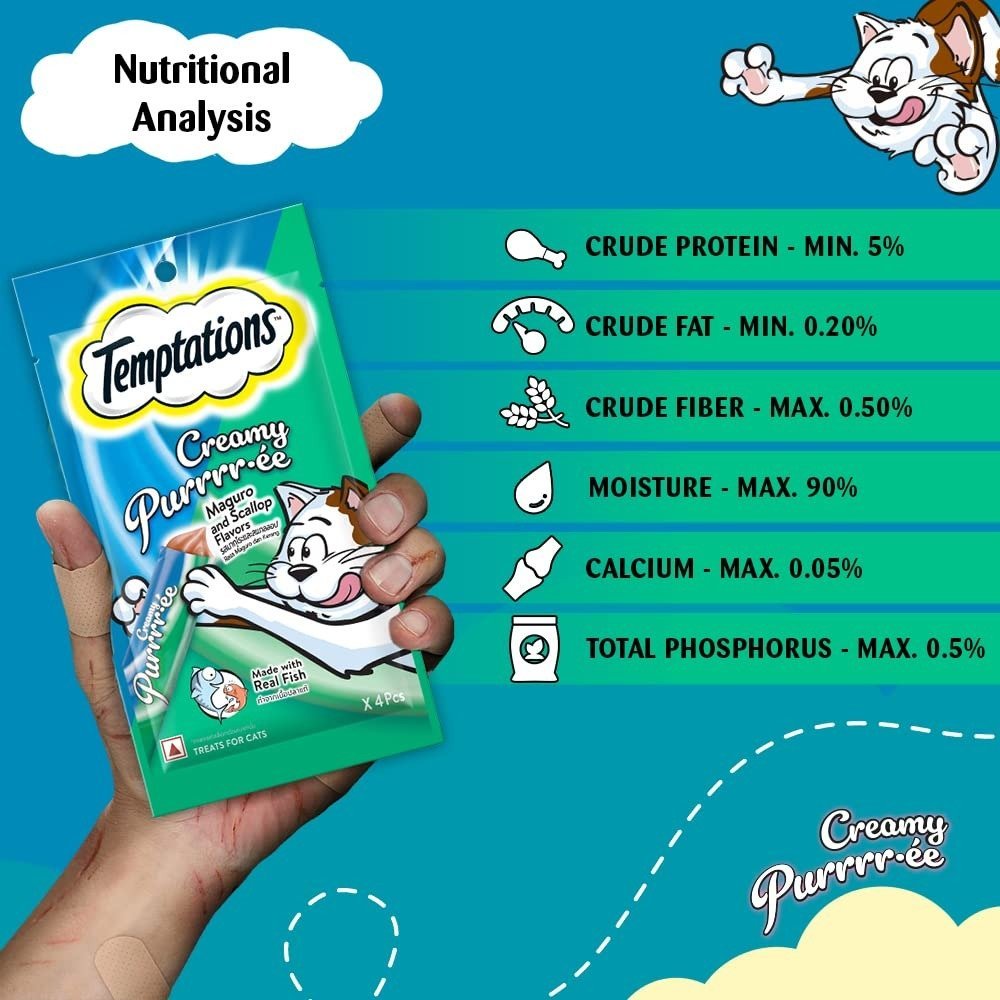 Creamylicious treats that will make your cat go meow! Delight them with Temptations Creamy Purrrr-ee Cat Treats which is loaded with deliciousness of maguro and scallop. The high magnesium content, rich vitamins like B3 & B5 and high quality protein make Temptations cat treats a healthier choice for your furball. Use it as a food topper to make your furball’s meal extra delicious & creamy or serve it in a bowl for a mess-free treating. You can even strengthen the bond with your cat by feeding Temptations treat with your hand. No matter how you feed, these treats are surely going to make your cat’s day purr-fect!