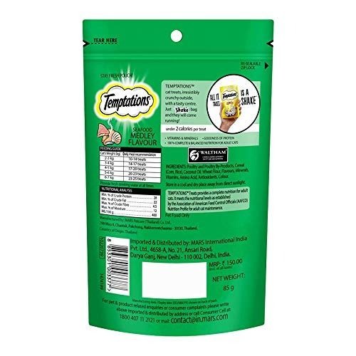 Unique pocket shape treat for cats with tasty chicken flavour that your cat will love;Come in a stay-fresh pack to keep your cat treats fresh; Also try Temptations Savoury Salmon, Seafood Medley and Tempting Tuna flavours