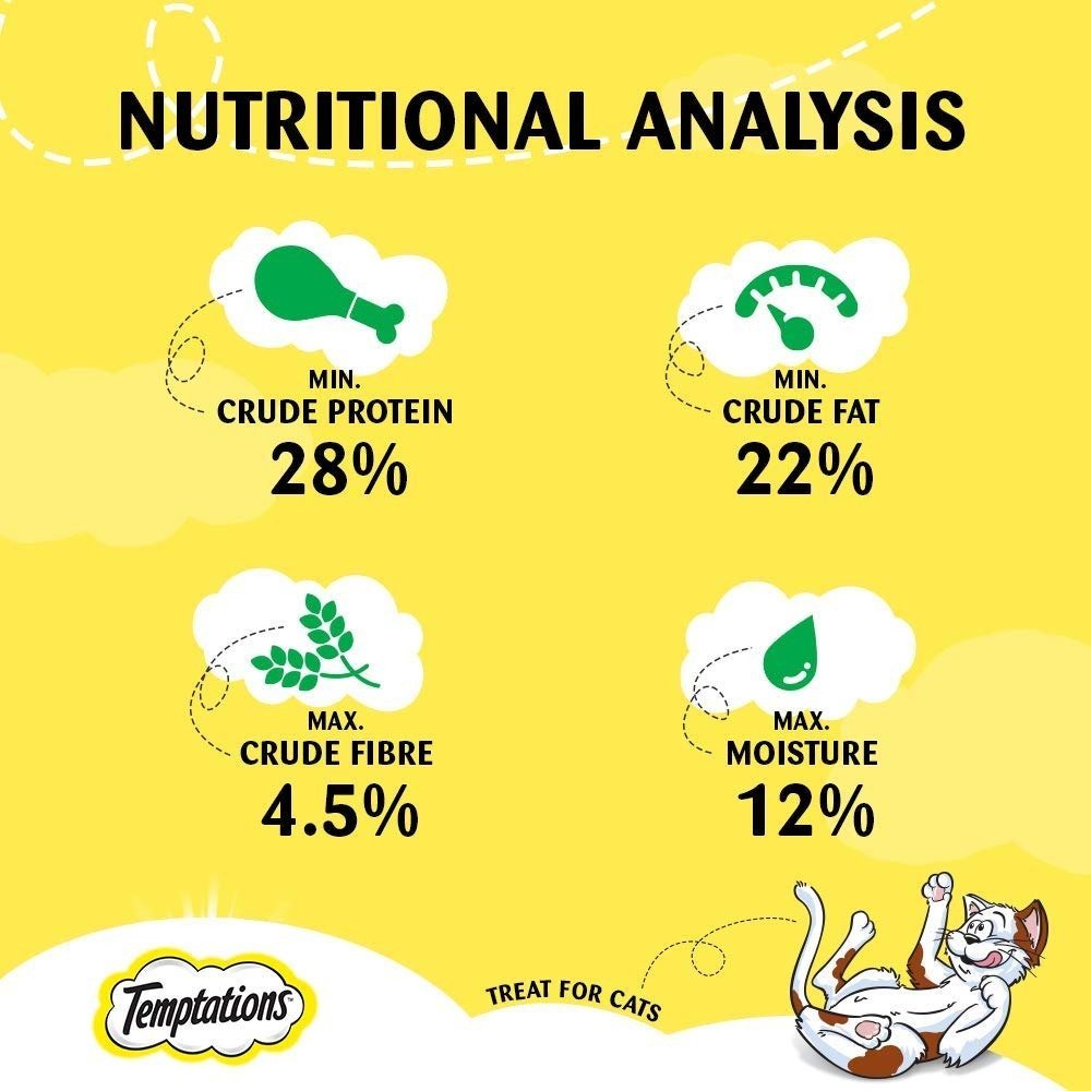 Temptations cat treat provide cats with 100% complete and balanced nutrition;Cat treat which is crunchy on the outside and soft and creamy on the inside