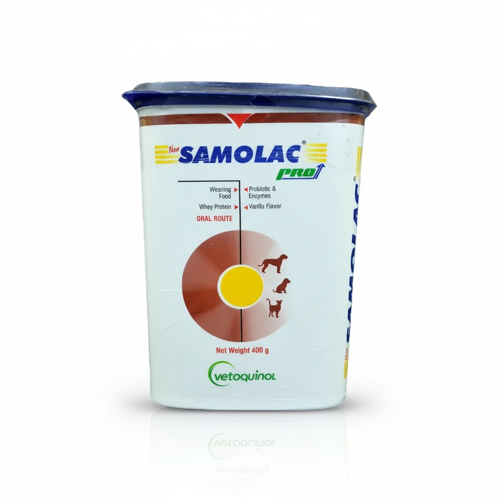 New Samolac pro is a weaning food for puppies and kittens, enriched with probiotics and enzymes. It helps to meet the nutritional requirement after weaning. Saccharomyces boulardii one of the ingredients helps in killing bad bacteria and maintains the good bacteria. It improves the gut health. Digestive enzymes diastase, lipase, protease and papain support in digestive function and reduces the gut inflammation. It also contains whey protein for development of muscle and immunity. Amino acids, vitamins and minerals helps in overall body growth and development. It has taurine for cognitive development.