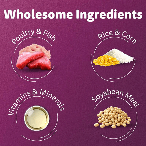Cereals (Corn and/or Wheat and/or Rice), Poultry and Poultry By-Products, Oils, Soybean Meal, Fish hydrolyzed, Minerals, Corn Gluten Meal, iodized Salt, Vitamins, Amino Acids, Colouring Agents, Preservatives, Flavours.