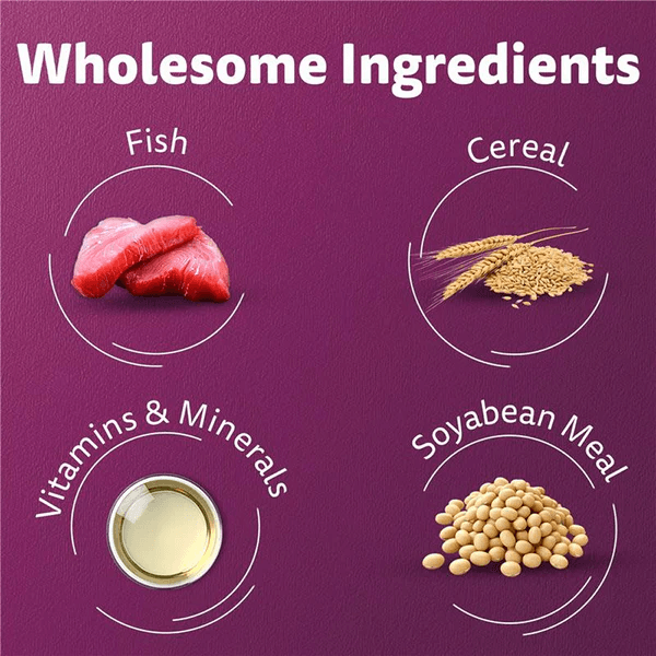 Cereals (Corn and/or Wheat and/or Rice), Poultry and Poultry By Products, Oils, Soybean Meal, Fish hydrolyzed, Minerals, Corn Gluten Meal, iodised salt, Vitamins, Amino Acids, Colouring Agents, Preservatives, Flavours